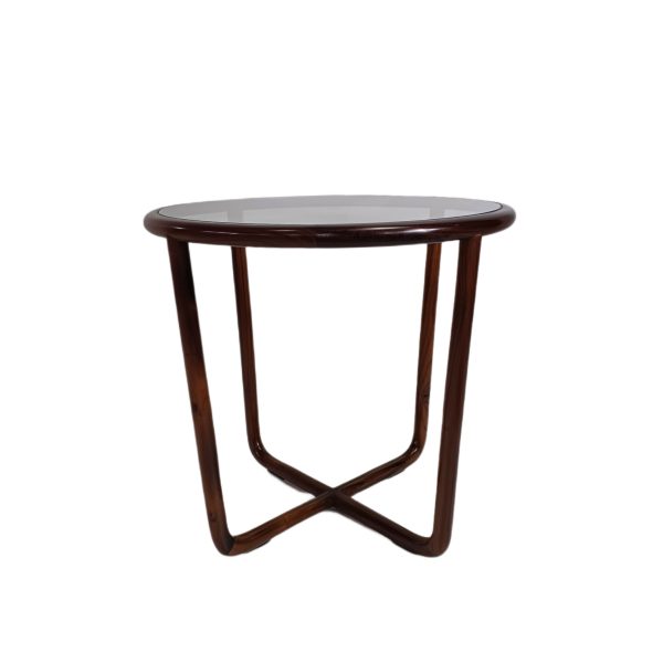 Mesa lateral com tampo de vidro e estrutura em jacaranda.